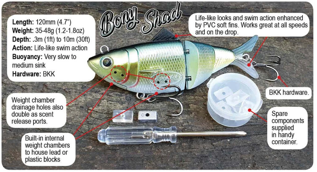 The Barambah Bony Shad is a super life-like shad swimbait with a built-in interchangeable weight system that allows it to be fished from as shallow as 1 foot down to 30+ feet applications. It has two internal weight chambers built-in to house lead or plastic blocks. Allowing you to dial the bait into depths you want to fish it, without ugly chin weights. This is quickly done with a screwdriver (supplied). Swim action is further enhanced by aluminium stabilising pectoral fins and a head mounted tow point, allowing the bait to track deep. The Bony Shad will suit a wide variety of fresh and saltwater applications.
