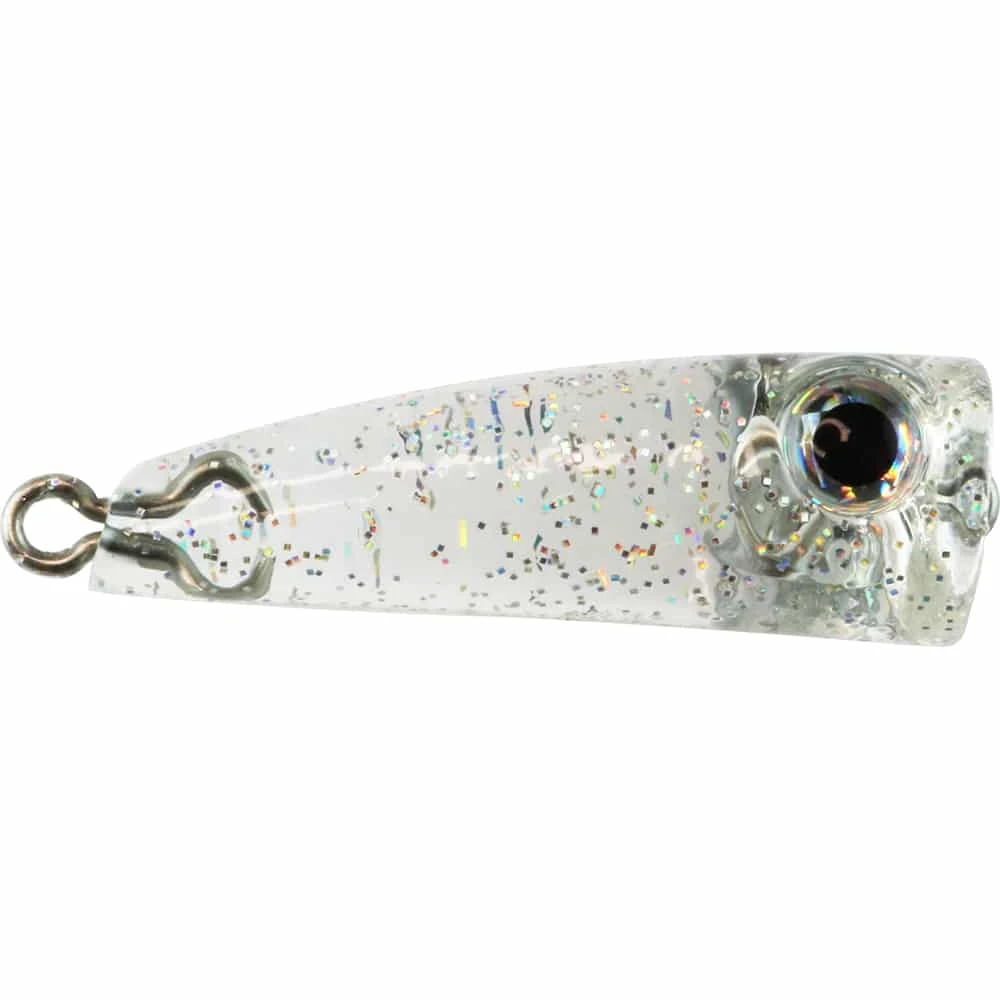 This popper is for every angler who wants to cast a lure into a bait school in the distance using the smallest lure possible. The solid resin sinking body suits long casts and a slowly sinking lure. The body structure of this CRYSTAL POPPER makes the light diffuse in the water and it looks like a school of white bait. The weight of 5.3g (55mm) gives it a great casting distance.
