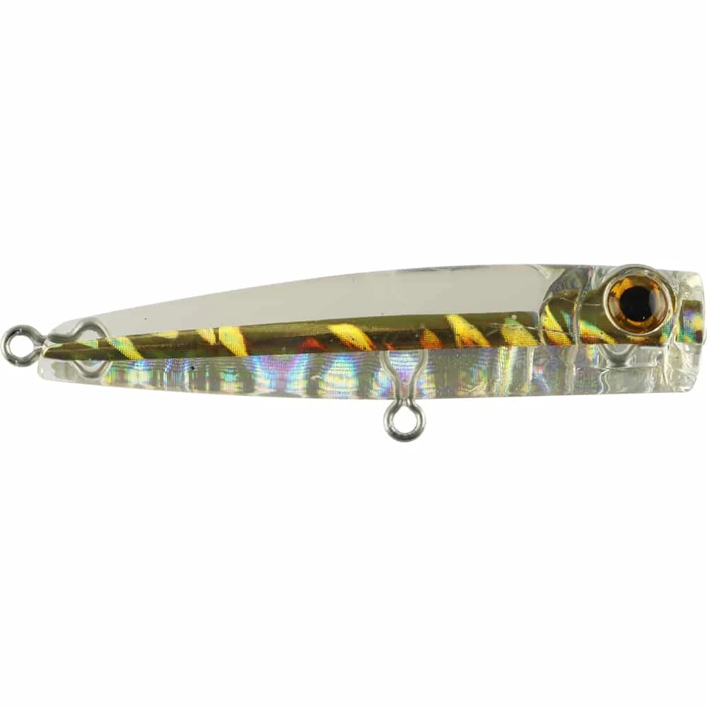 This popper is for every angler who wants to cast a lure into a bait school in the distance using the smallest lure possible. The solid resin sinking body and resulting weight, casts long and accurately all day and the clear body will reflect light making it appear that your lure is amongst a school of fish. Rigged with a single treble, this sinking lure is designed to be retrieved along the surface like a fleeing baitfish.