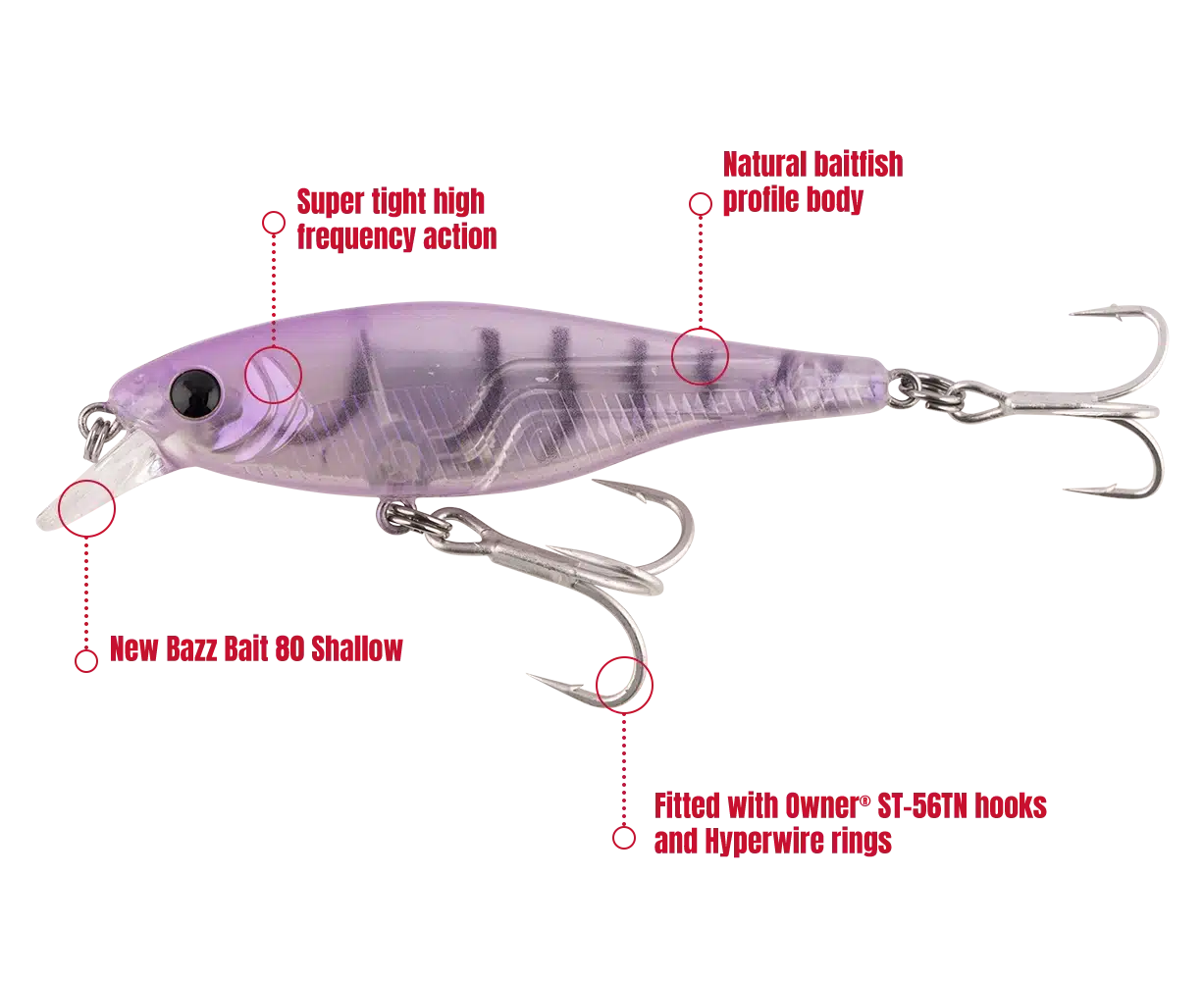 The smaller bibbed design gives anglers the perfect tool to fish shallow laydown structures, flats and rock bars with the same suspending super tight action as the deep version of the Bazz Bait. All Bazz Bait 80S lures are fitted with Owner rings and ST-56TN hooks to keep the toughest brawlers connected when you need it the most.