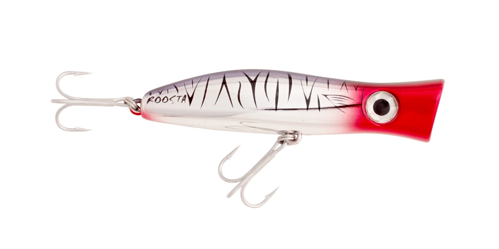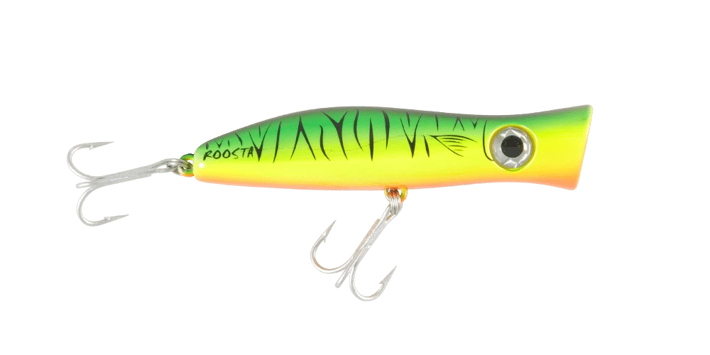 The Halco Roosta Popper 105 Lure is a surface popper and blooper. Catch big salt water fish with this surface popping lure as it splashes about attracting nearby fish. By changing the height of your rod tip, you are able to change how the lure responds and swims underwater – a rod tip closer to the water surface produces a stronger bubble action and is ideal in rough conditions or strong winds. The Roosta Popper 105 is designed to target salt water predators such as mackerel, trevally and many more.